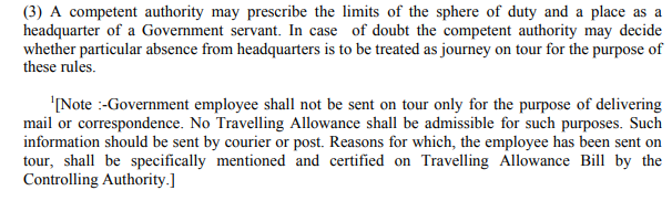 नोट: - सरकारी कर्मचारी मेल या पत्राचार देने के उद्देश्य से केवल दौरे पर नहीं भेजा जाएगा। ऐसे उद्देश्यों के लिए कोई यात्रा भत्ता स्वीकार्य नहीं होगा। ऐसी जानकारी कूरियर या पोस्ट द्वारा भेजी जानी चाहिए। जिसके कारण, कर्मचारी को दौरे पर भेजा गया है, विशेष रूप से नियंत्रण प्राधिकरण द्वारा यात्रा भत्ता विधेयक पर निर्दिष्ट और प्रमाणित किया जाएगा।
