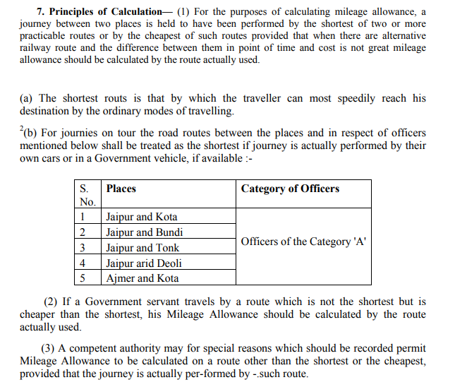 गणना के सिद्धांत- (1) माइलेज भत्ता की गणना के प्रयोजनों के लिए, दो स्थानों के बीच की एक यात्रा, दो या दो से अधिक व्यावहारिक मार्गों में से सबसे नजदीकी मार्ग या इस प्रकार के मार्गो में से सबसे सस्ते मार्ग जब वैकल्पिक रेलवे मार्ग होता है। समय और लागत के हिसाब से उनके बीच का अंतर बहुत अच्छा नहीं होता है तो माइलेज भत्ता की गणना वास्तव में इस्तेमाल किए गए मार्ग से की जानी चाहिए। सबसे नजदीकी मार्ग यह है कि यात्री यात्रा के सामान्य तरीकों से अपने गंतव्य तक तेजी से पहुंच सकता हैं।