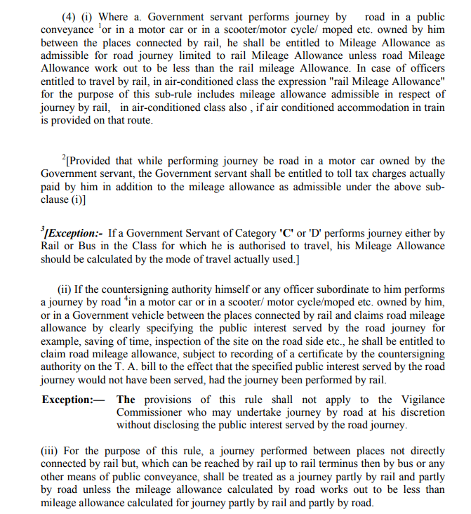 (4) जहां एक सरकारी कर्मचारी सार्वजनिक वाहन में या खुद के स्वामित्व वाली मोटर कार में या स्कूटर / मोटर साइकिल / मोपेड इत्यादि में रेल द्वारा जुड़े स्थानों के बीच सड़क के माध्यम से यात्रा करता है, वह सड़क यात्रा के लिए माइलेज भत्ता के हकदार होंगे जब तक कि सड़क लाभ भत्ता स्वीकार्य रेल माइलेज भत्ता तक सीमित रेल लाभ भत्ता से कम हो। नोट- सरकारी कर्मचारी के स्वामित्व वाली मोटर कार में सड़क पर यात्रा करने के दौरान, सरकारी कर्मचारी उपरोक्त नियम के तहत स्वीकार्य लाभ भत्ता के अलावा वास्तव में उनके द्वारा भुगतान किए गए टोल कर शुल्क का हकदार होगा। अपवाद: - यदि श्रेणी 'सी' या 'डी' का कोई सरकारी कर्मचारी रेल या बस से यात्रा करता है तो उसका माइलेज भत्ता वास्तव में इस्तेमाल किए जाने वाले यात्रा के तरीके से गणना की जानी चाहिए।