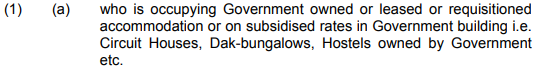(1) A.जिसने सरकारी स्वामित्व या पट्टे या अधिग्रहण आवास या सब्सिडी दरों पर सरकारी भवन जैसे-सर्किट हाउस, डाक-बंगले, सरकार के स्वामित्व वाले हॉस्टल आदि पर कब्जा कर रहा है।