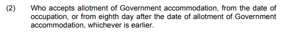 2.व्यवसाय की तारीख से या सरकारी आवास के आवंटन की तारीख के आठवें दिन से सरकारी आवास के आवंटन को स्वीकार करता है, जो भी पहले हो।