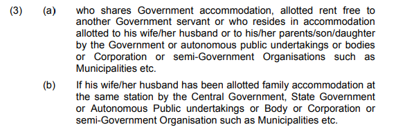 3.जो सरकारी आवास साझा करता है, एक अन्य सरकारी कर्मचारी को आवंटित निःशुल्क किराए के आवास को या सरकार या स्वायत्त सार्वजनिक उपक्रमों या निकायों या निगम या अर्द्ध सरकारी संगठन जैसे कि नगर पालिका आदि द्वारा अपनी पत्नी / उसके पति या उसके माता-पिता / बेटे / बेटी को आवंटित आवास में रहता हो।